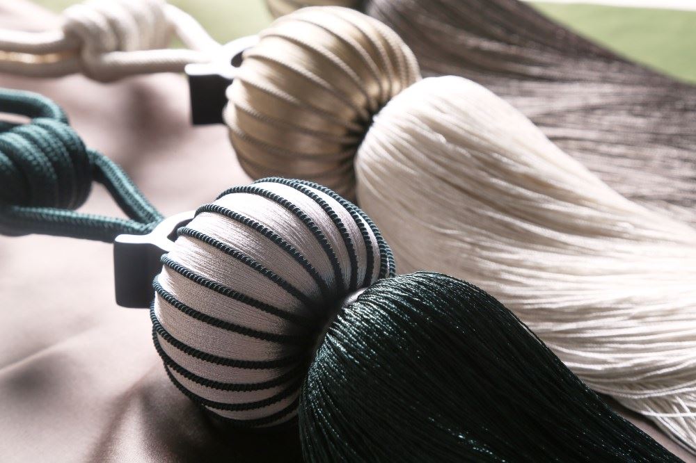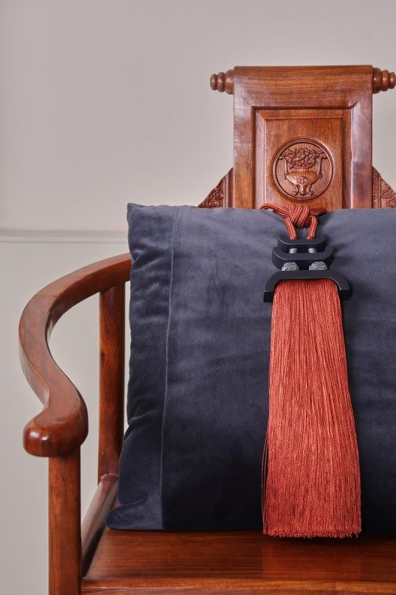 我們依據(jù)梅花窗的圖案,設(shè)計(jì)了兩款帶子,搭配窗簾和抱枕,把江南唯美的文化氛圍,通過與布藝的結(jié)合置入中式家居。